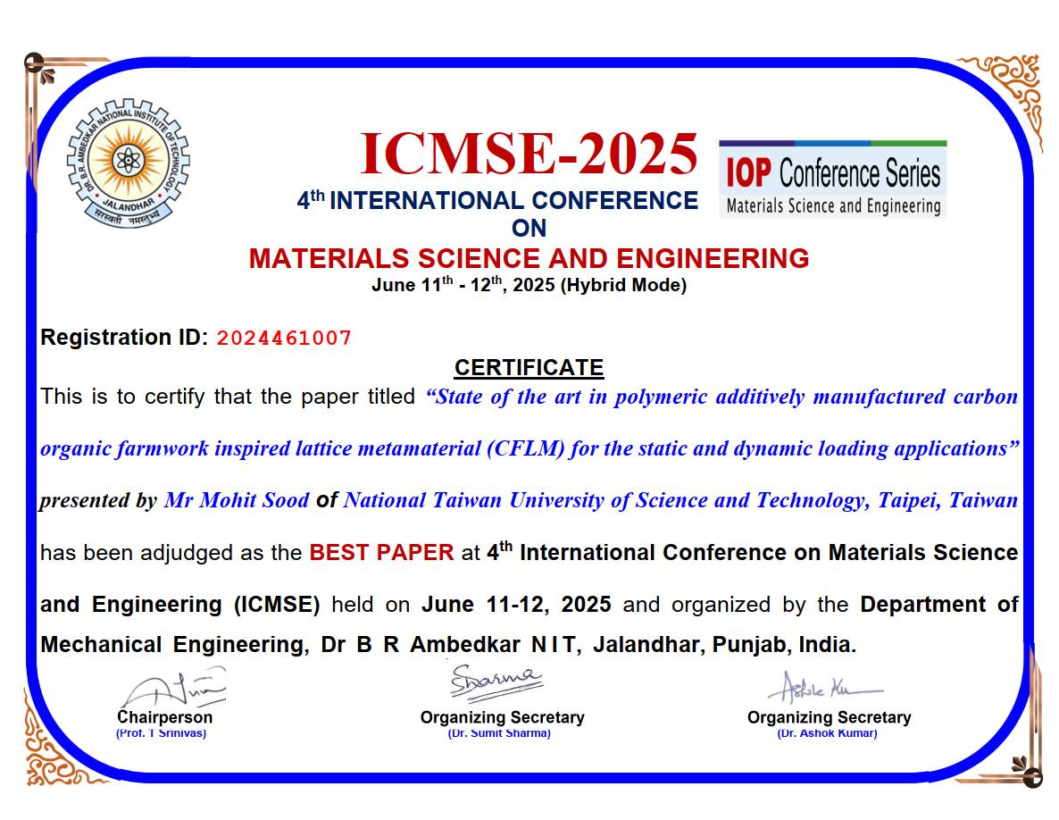 於 2025 年第四屆國際材料科學與工程研討會論文榮獲 Best Paper